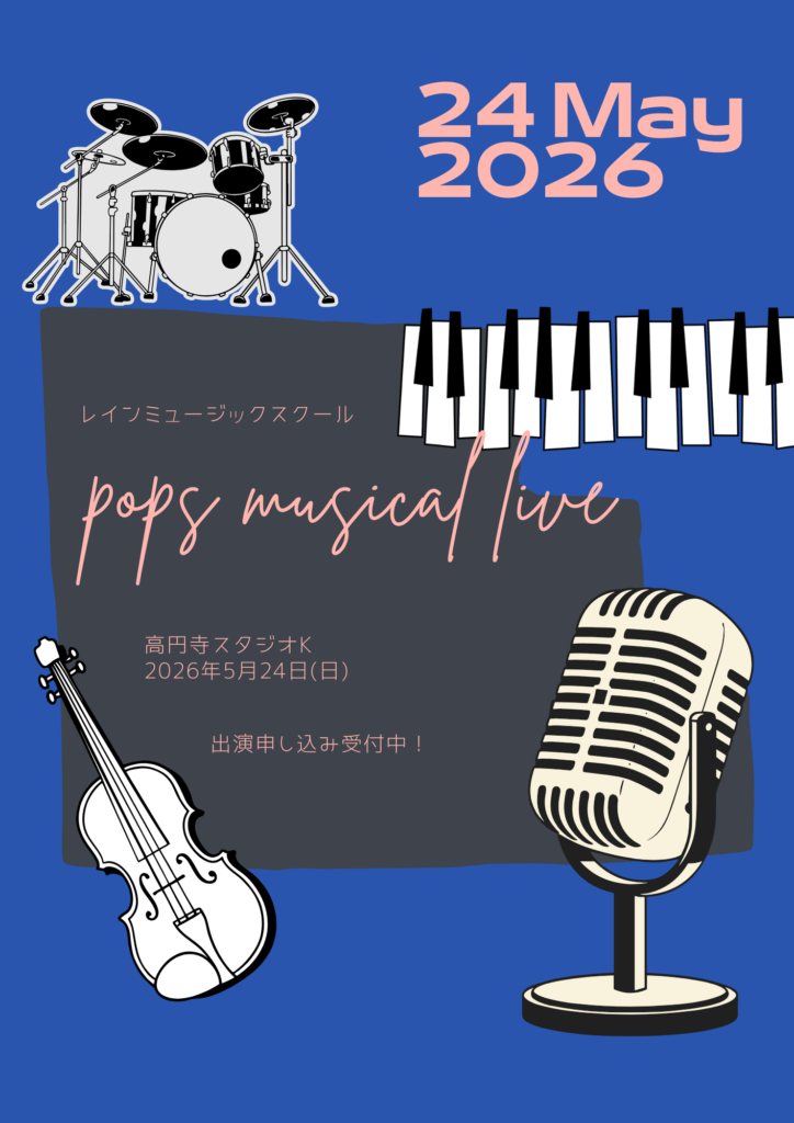 今回は、ポピュラー&ミュージカルボーカルコースの生徒さん+ヴァイオリンの生徒さんが出演!(ピアノ他全楽器参加OKです)