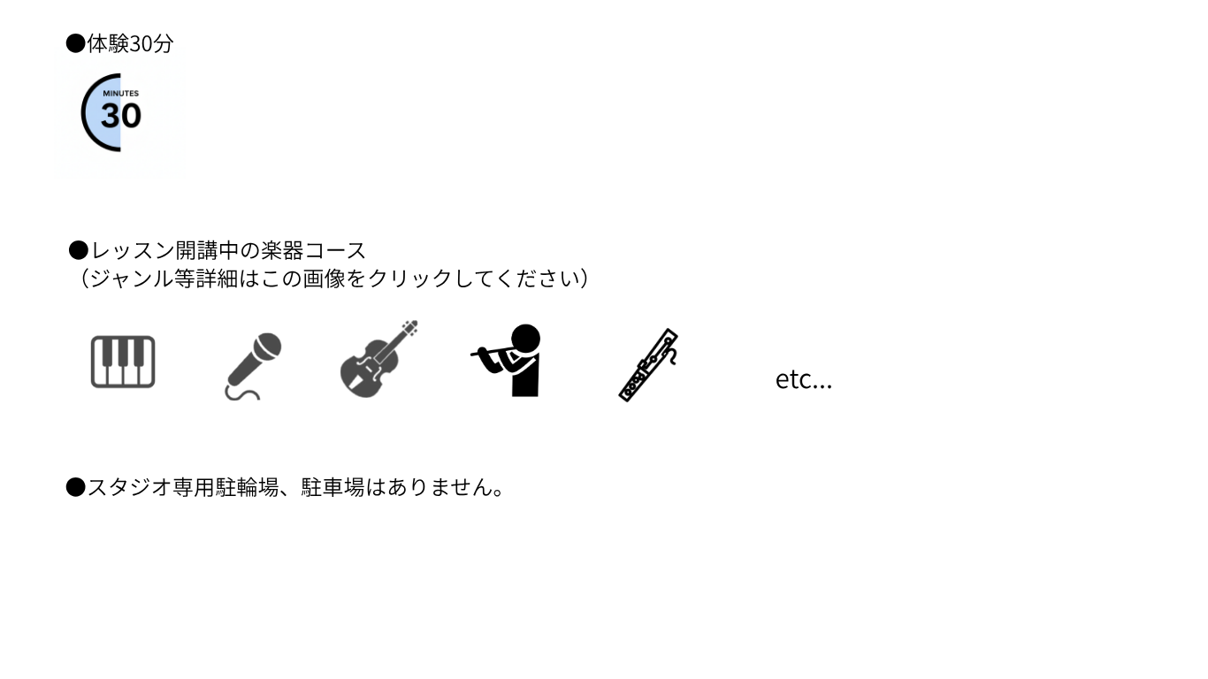 ピアノレッスン / 子どものピアノレッスン / クラシックピアノ教室 / ポピュラーピアノ教室 / コード奏法・ピアノ弾き語り教室 / ボーカル・声楽レッスン / 子どものボーカル教室 / クラシック声楽・オペラ教室 / ミュージカルボーカル教室 / 弦楽器レッスン / ヴァイオリン教室 / ヴィオラ教室 / サックス / フルート / クラリネット / 木管楽器レッスン / ホルン / トランペットレッスン / 金管楽器(トランペット・ホルン)レッスン / ソルフェージュレッスン